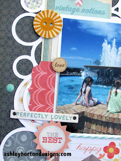 I used the LMT Washi Tape on my layout to create two pleated flowers. I cut a 2 inch and 1.5 inch circle from cardstock, and then pleated the Washi Tape from the outside edge of the circle, to the center. I finished it off by adding a wooden button to the center.